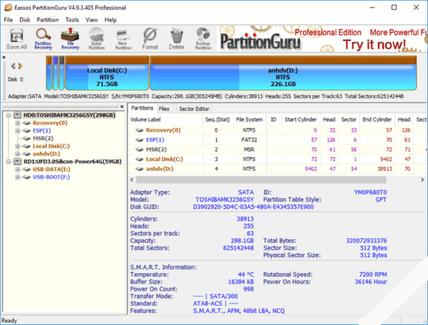 Các tính năng cơ bản của PartitonGuru Pro - PartitionGuru phân vùng ổ cứng mạnh mẽ: phân chia ổ cứng, thay đổi kích thước phân vùng an toàn không mất dữ liệu. Hỗ trợ chuyển đổi qua lại giữa ổ cứng MBR và GPT. Chuyển đổi từ ổ cứng dynamic sang basic không mất dữ liệu.